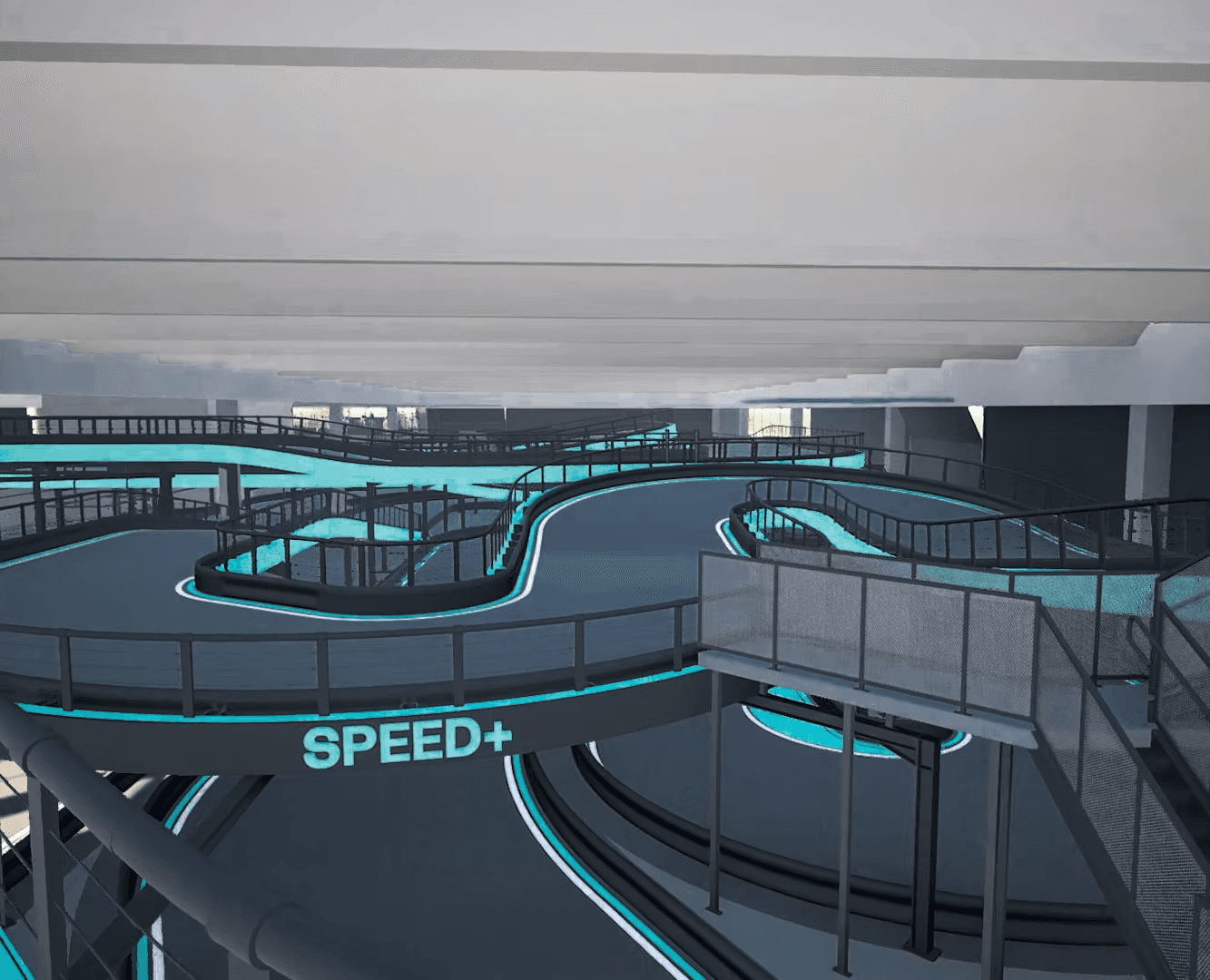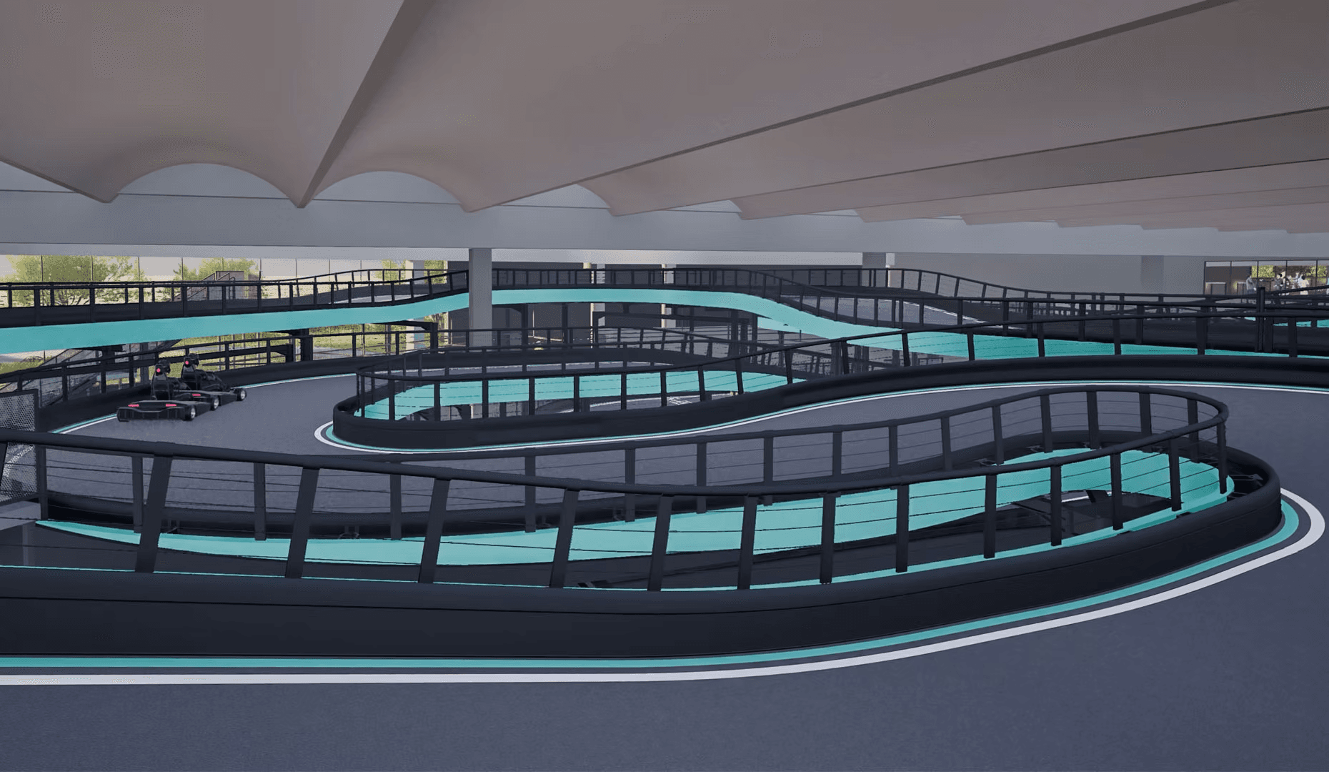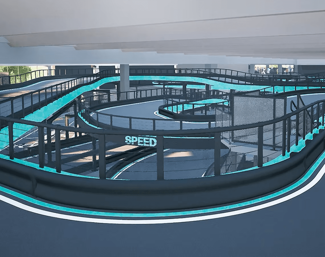 La struttura Multi-Level, progettata insieme a 360 Karting, si sviluppa su tre livelli. Con un’altezza massima di 4,5 metri, livelli intermedi e 11 cambi di pendenza tra salite e discese. Tutta la sezione sopraelevata copre circa 400 metri dei 750 metri totali della pista indoor.