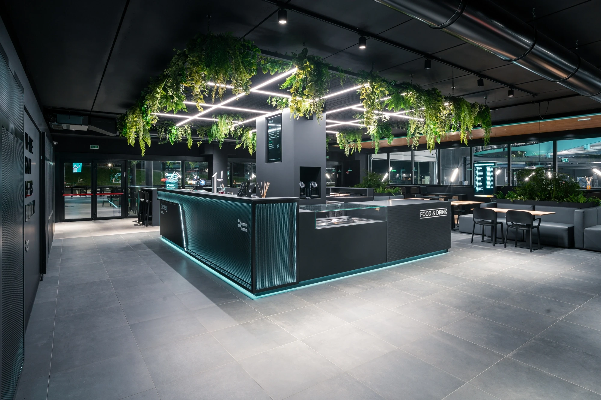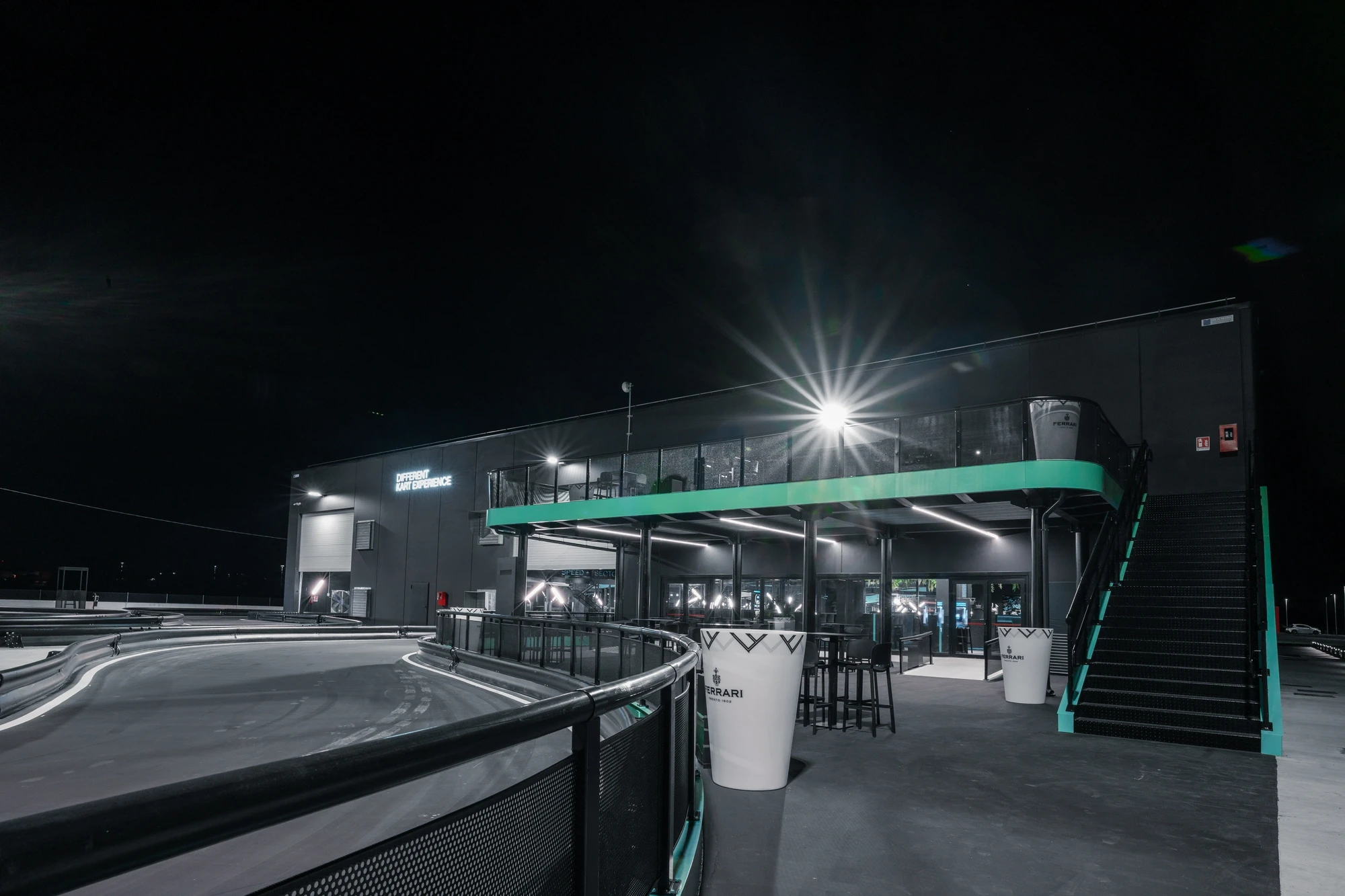 Fuori dal tracciato, l’esperienza continua negli spazi dedicati alla socialità e all’attesa: bar e area Food&Drink con oltre 60 posti a sedere, ambienti luminosi e materiali caldi, affacci interni ed esterni che permettono di seguire le sessioni in pista anche da spettatori. A completare questa parte del percorso, una terrazza panoramica di circa 150 mq, direttamente affacciata sulla pista outdoor.